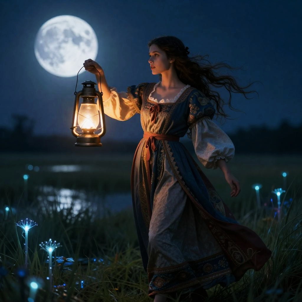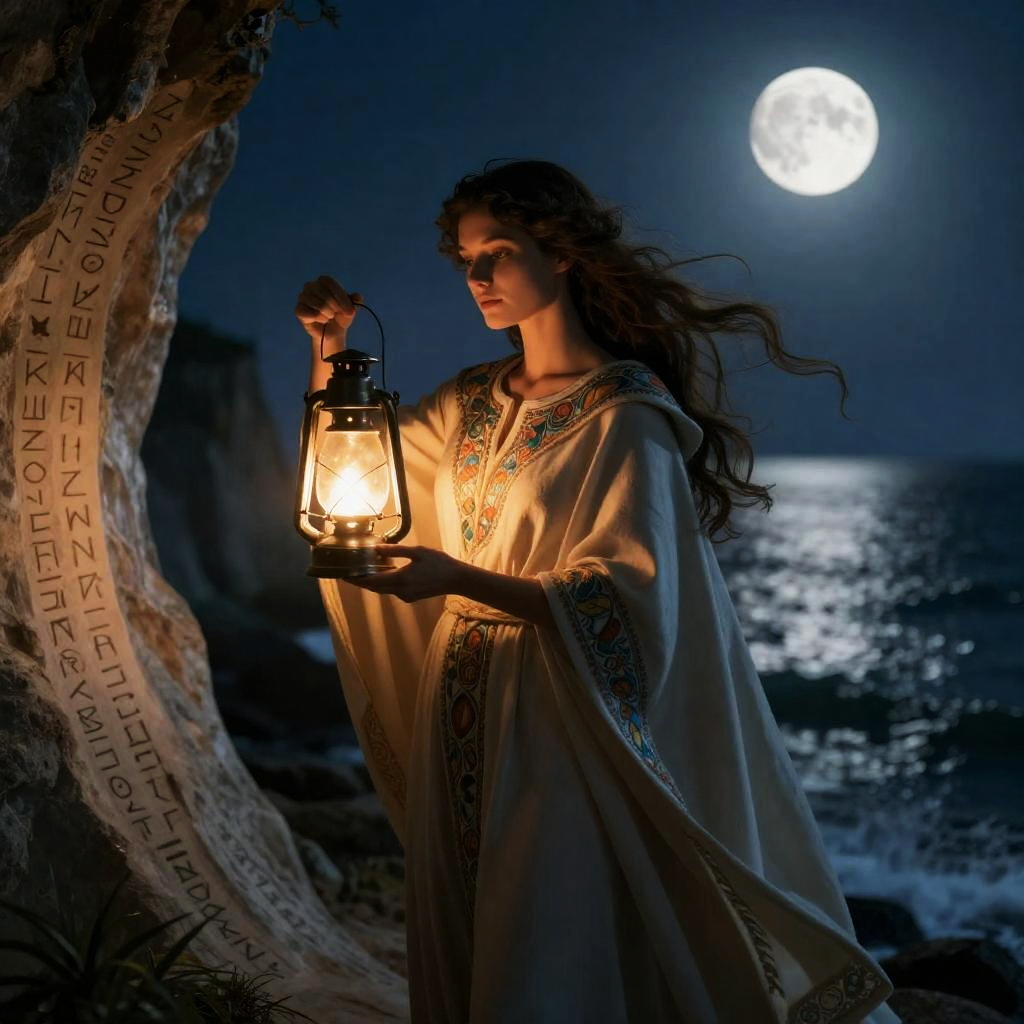 Mysterious Woman in Black Cloak in Desert Under Moonlight