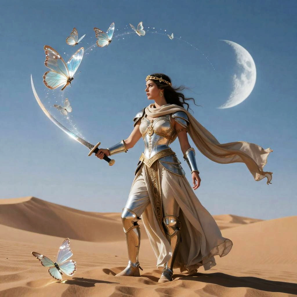 Inspired by the enchanting styles of Joan club and Niroot Puttapipat, envision a mystical scene set in a deserted desert landscape under a crescent moon. Center a captivating mysterious figure in shadowy cloak who embodies grace and strength, surrounded by elements that enhance the surreal atmosphere, rendered in exceptional detail with striking depth of field and dramatic cinematic lighting.