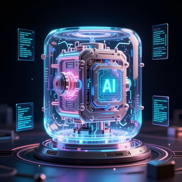 Digital CGI of a neon-lit, futuristic, encased robotic device with glowing blue "A" symbol, surrounded by holographic text, set against