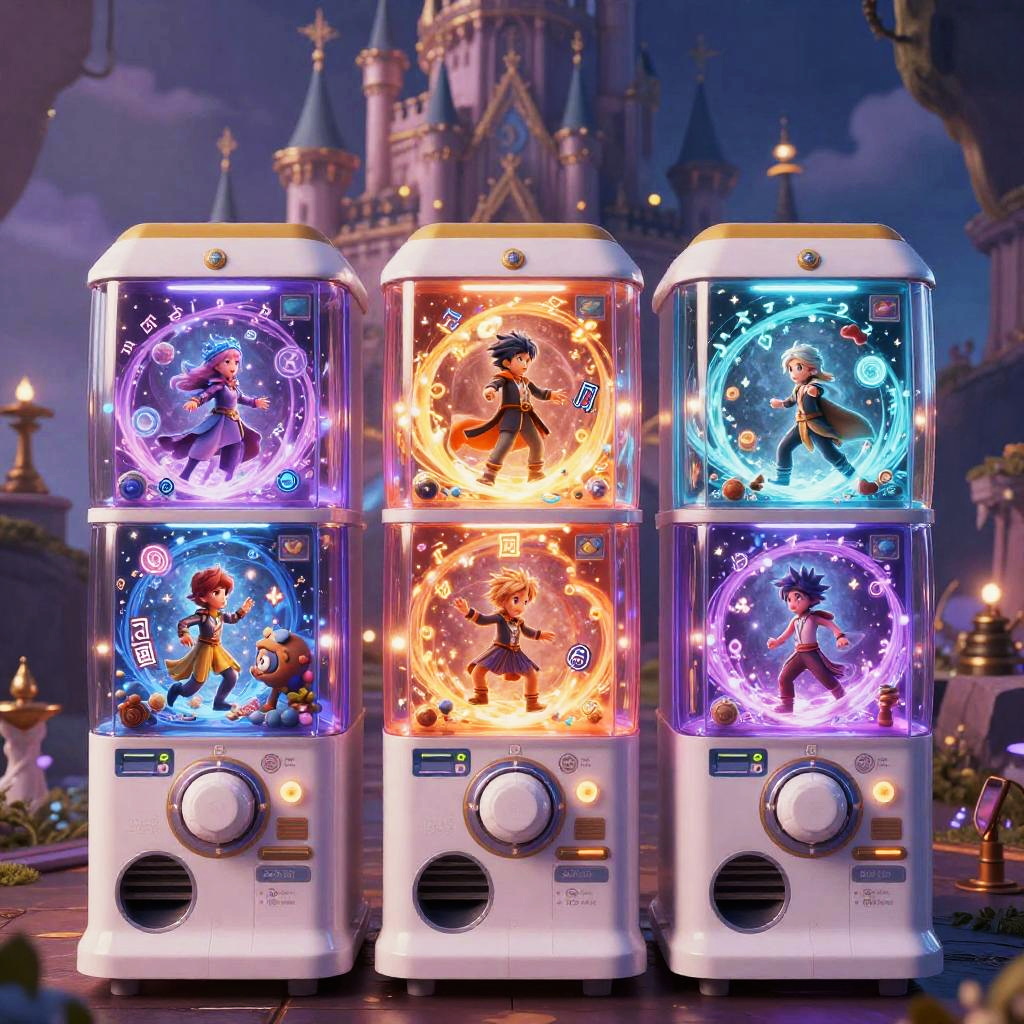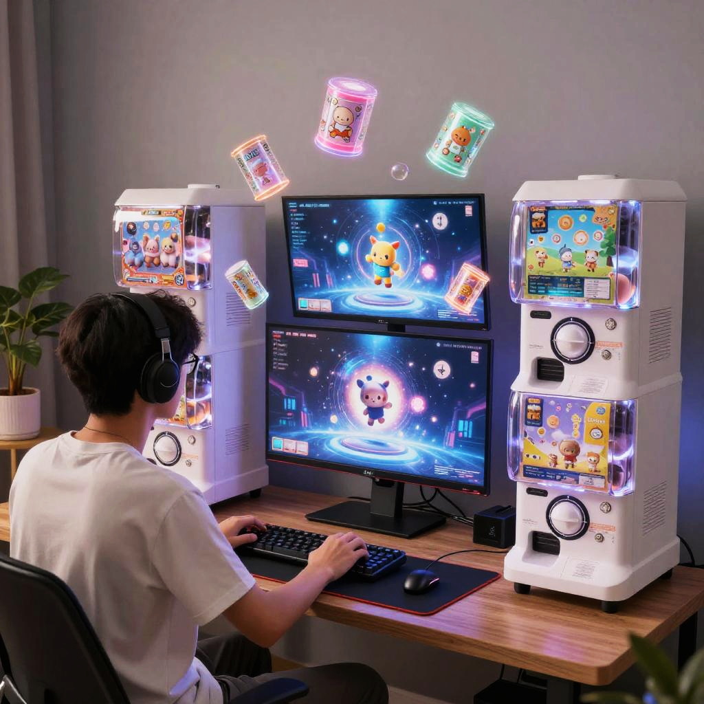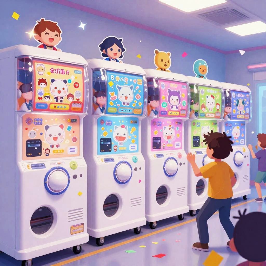 An illustrated gachapon online game lobby, vibrant digital gacha machines lined up with animated UI elements, excited avatars gathered around, colorful confetti and sparkles, lively and whimsical style, clean futuristic design, dynamic composition