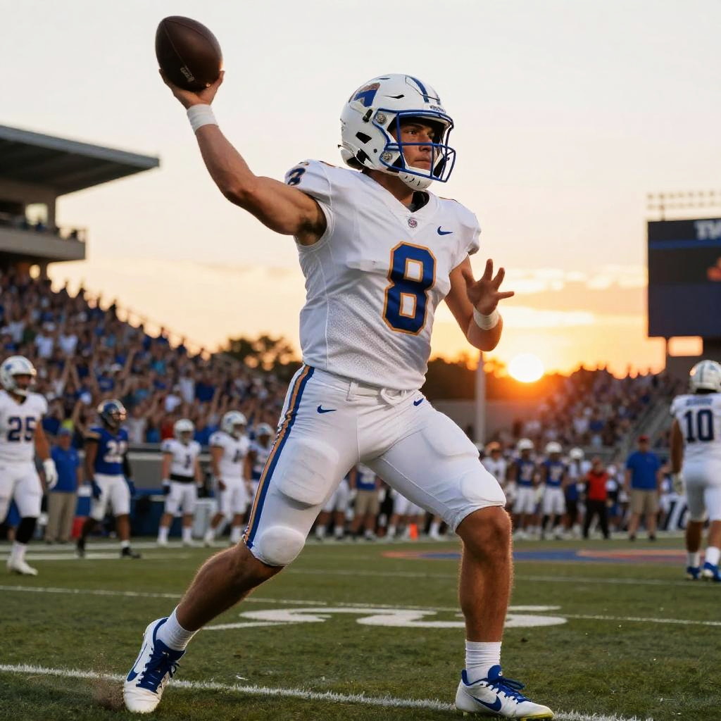 Photograph of a muscular male quarterback in white uniform with blue number 8, mid-throw, at sunset in a packed stadium.