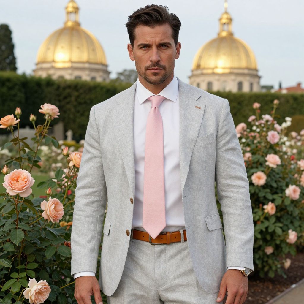 A man, light gray linen suit, white cotton dress shirt, pastel pink tie, tan leather derby shoes, matching tan leather belt, majestic domes reflecting golden sunlight, lush gardens with blooming roses, confident expression, cameraphone style. Man has masculine face and piercing eyes