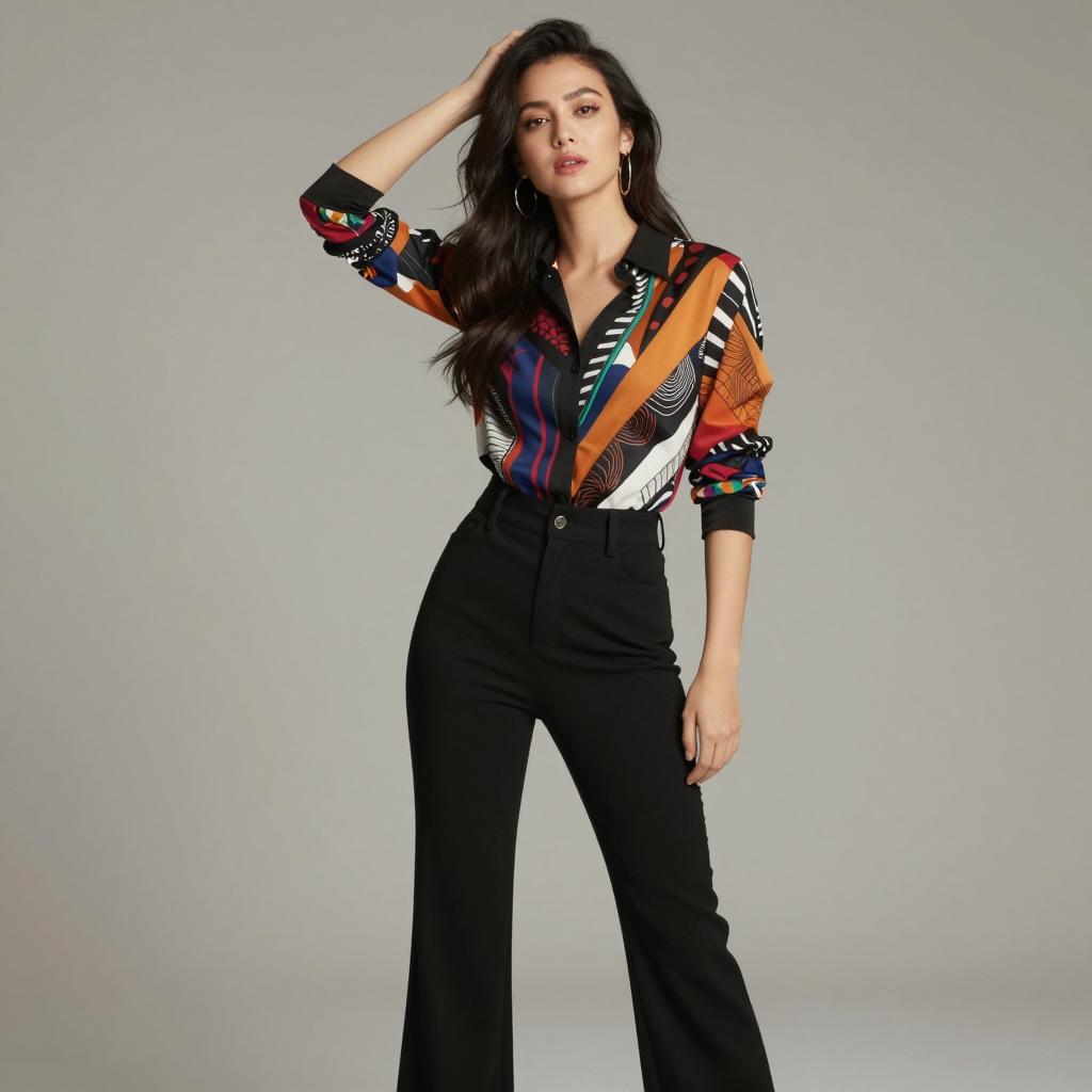 This elegant fashion photograph features a confident woman posing in a striking outfit with a vibrant design. Her pose and expression convey a sense of empowerment, while the soft, neutral background emphasizes her stylish attire. The image showcases modern fashion aesthetics with a focus on contemporary styling and composition.