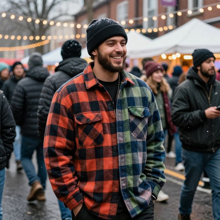Streetwear flannel shirts being worn during a winter street festival, attendees laughing under string lights, cold weather, snowflakes drifting, community vibe with bold textures and layered fashion details.