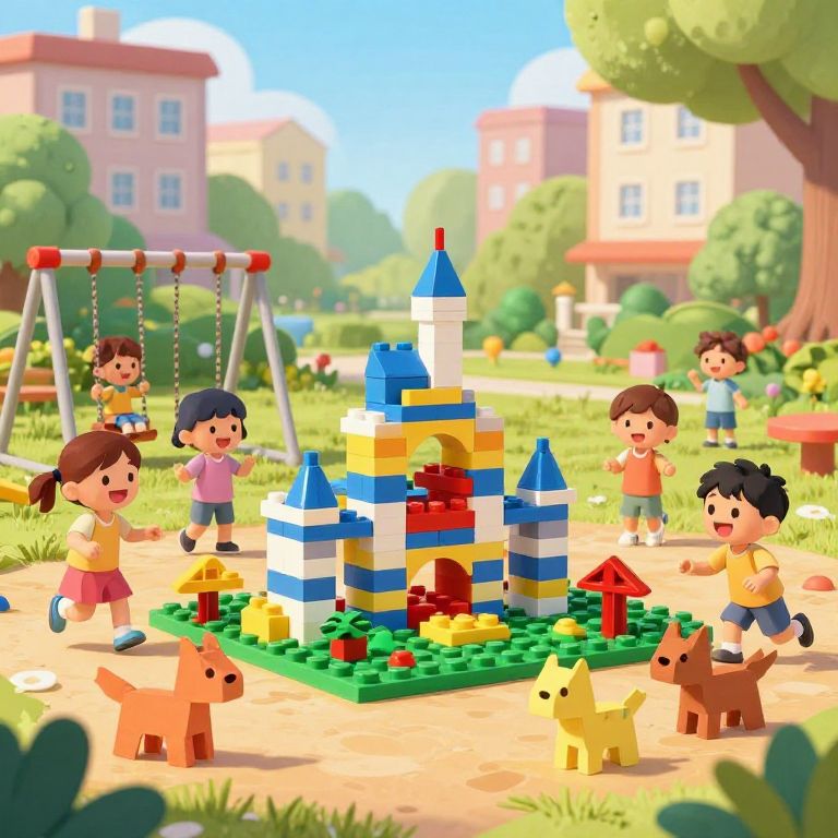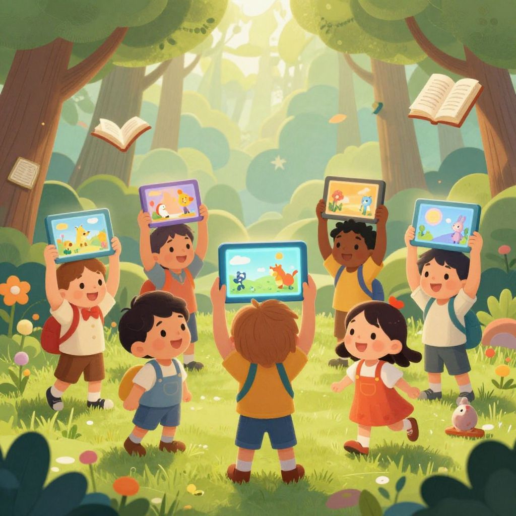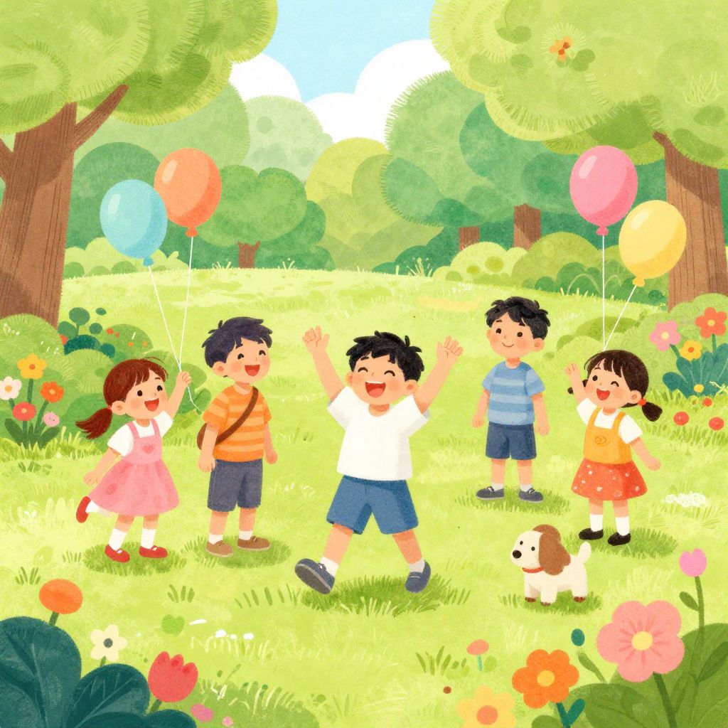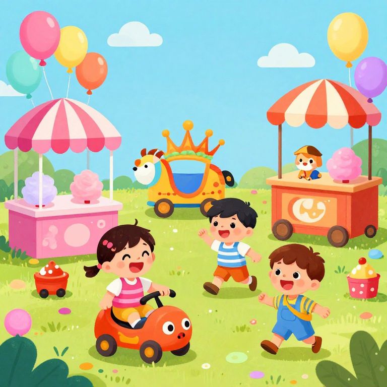 Infantil carnival setting with balloons, cotton candy stands, and kids happily exploring colorful rides, all portrayed in a lively, cartoonish style with exaggerated joyful expressions and bright, saturated colors