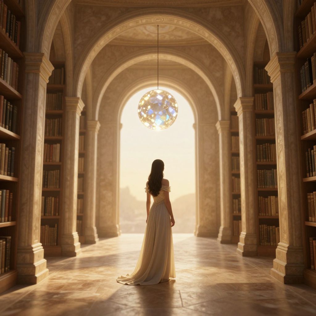 A serene 3D-rendered library bathed in golden hour light features a woman in a flowing gown standing before a series of arches, her back turned as she gazes toward a glowing crystalline sphere suspended in the distance, evoking a sense of timeless wonder and immersion in the echoes of ancient knowledge.