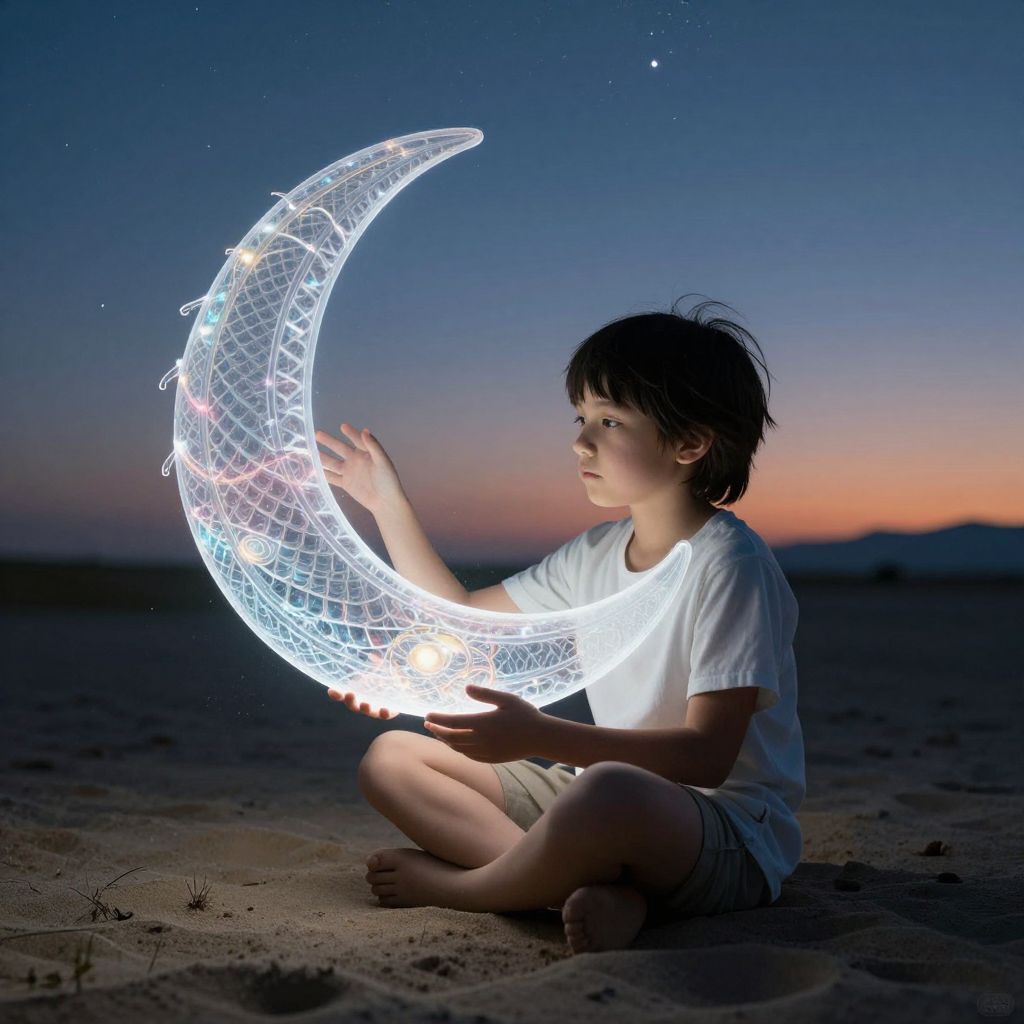 Photograph of a young boy with short black hair, sitting on sandy beach at dusk, holding a glowing, wireframe crescent moon.