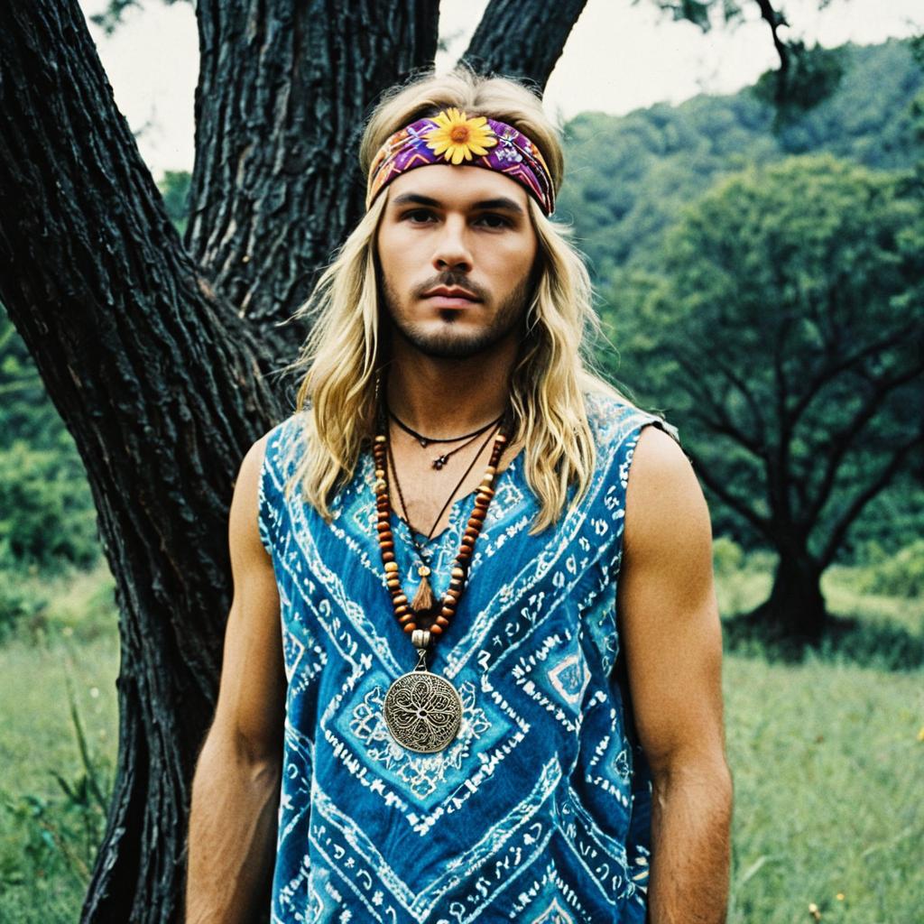 Full body portrait of a topless young blonde male wearing a straw hat, colorful mambo dance costume pants with a large decorative belt, multiple layered necklaces, bracelets, and black sandals, standing confidently with hands on hips against a dark background.