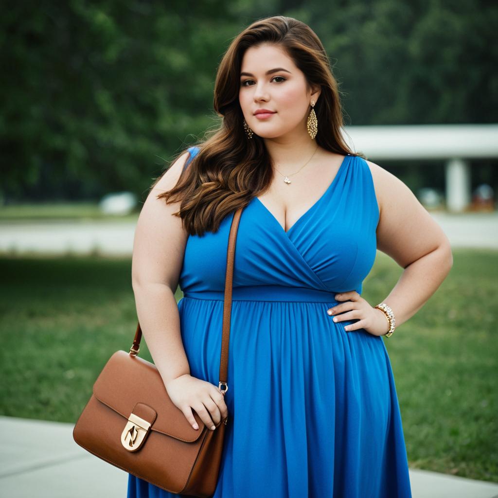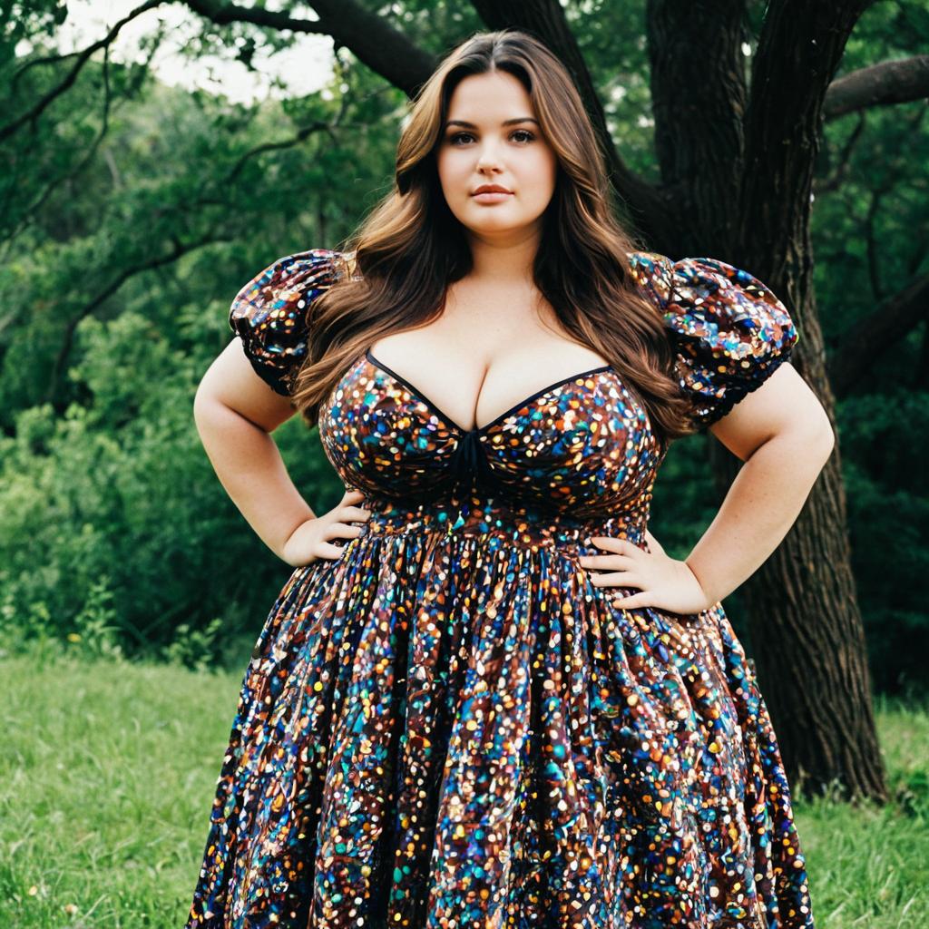 Plus size hiking clothes,1girl, solo, dress, brown hair, nature, long hair, sandals, outdoors, breasts, forest, standing, blurry