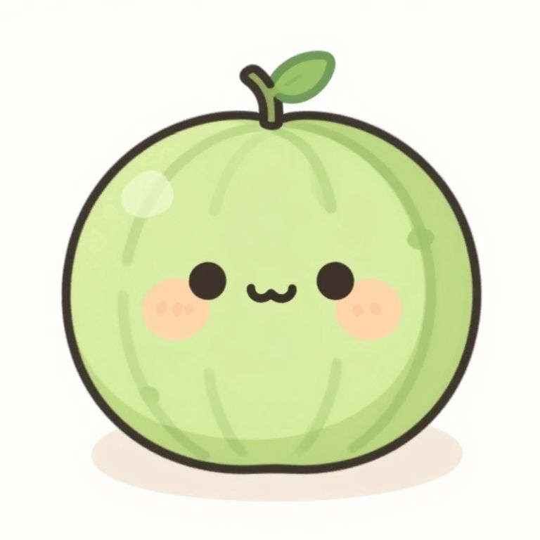 A cute, kawaii-style illustration of a melon with a smiling face, set against a simple, minimalist background.