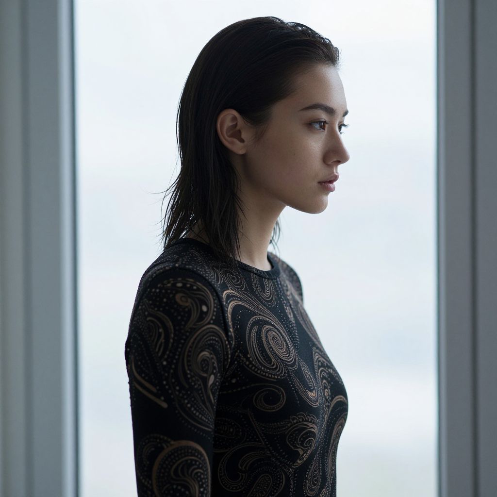 Photograph of a young woman with wet, slicked-back dark hair standing in profile by a window. She's wearing a black, long-sleeve, intricately patterned top with swirling, organic designs in shades of gold and brown. The background is slightly blurred with a bright, overexposed window, giving a soft, cool light to the scene. Her expression is calm and focused.