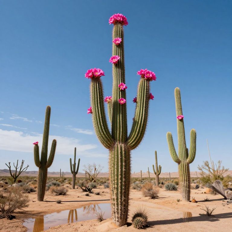 Photograph of a desert landscape featuring tall, green cacti with prominent, vibrant pink flowers at the tips. The central cactus has multiple arms adorned with clusters of flowers. Other cacti, varying in height and arm count, are scattered across the sandy, sunlit ground. Sparse desert vegetation and small puddles are visible. The sky is clear and bright blue, contrasting with the sandy beige of the desert floor. The image captures the arid, yet colorful, beauty of the desert environment.