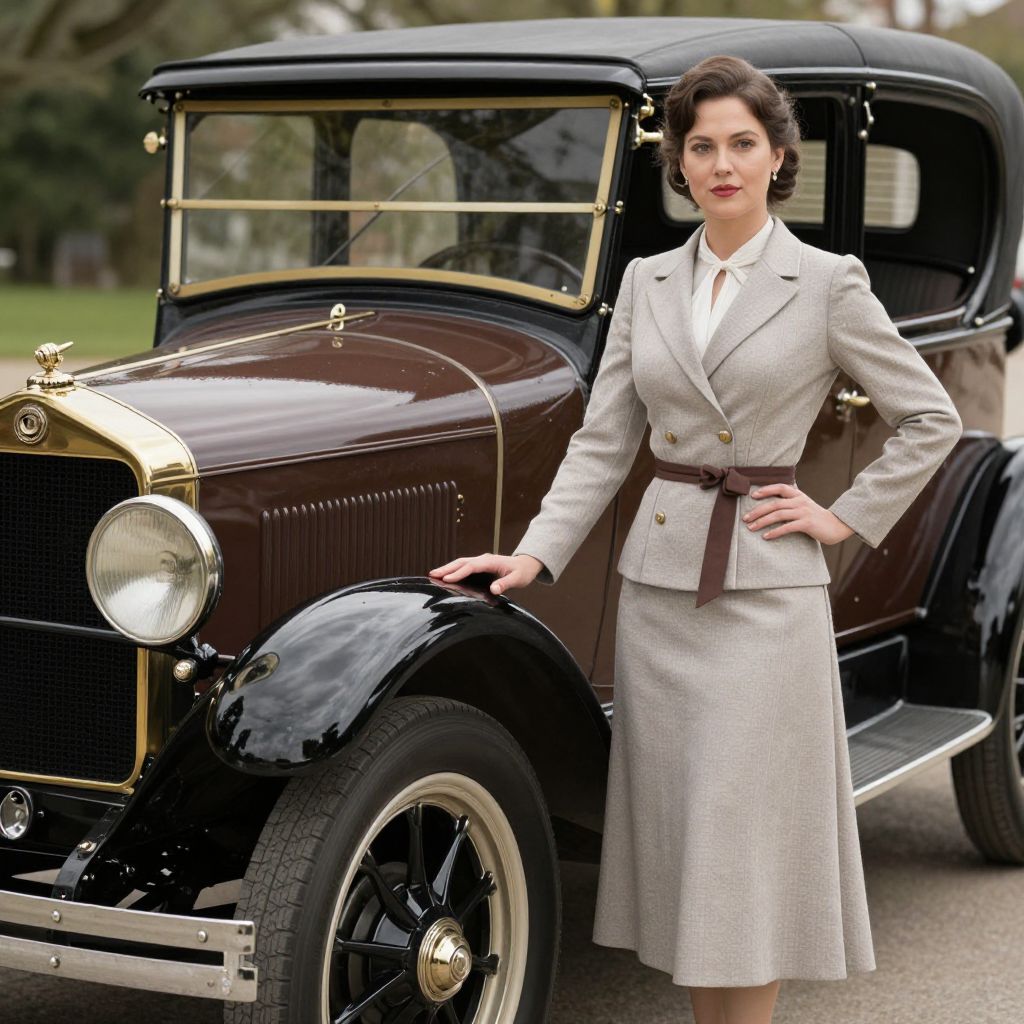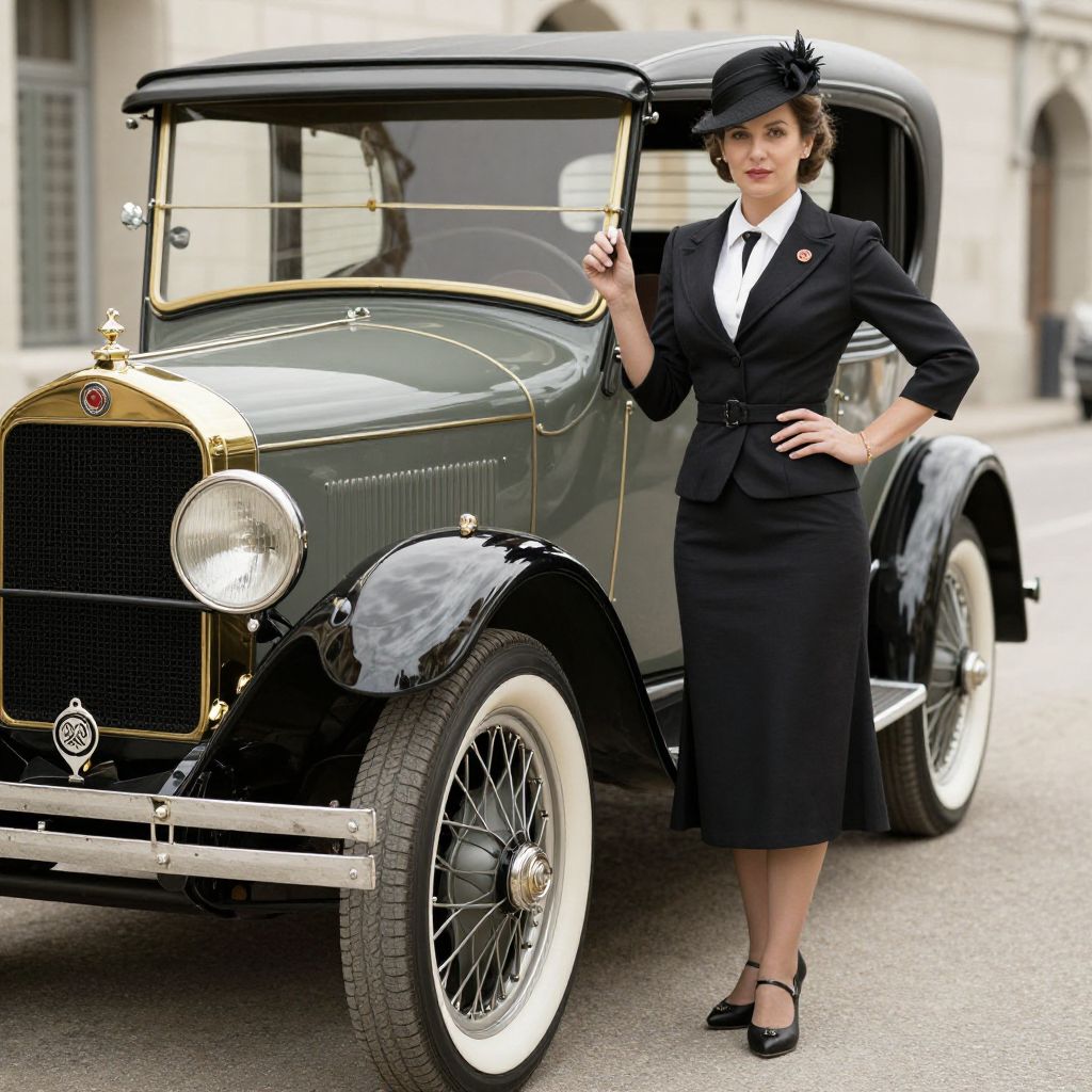 Elegant vintage car parked beside a confident woman in period attire, showcasing early character and automotive design with intricate details and a timeless aesthetic.
