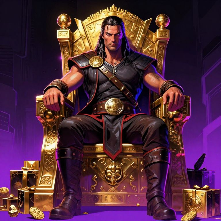 Axel Schaefer estilo cyber punk neon an amazing piece of art depicting a Conan the Barbarian sitting in a throne gold and treasure around the throne, stron facial expresiion 16:9,