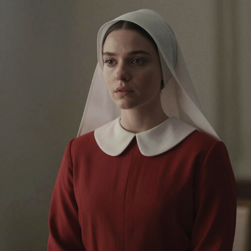 Handmaid Tale, woman in red and white dress with a white collar
