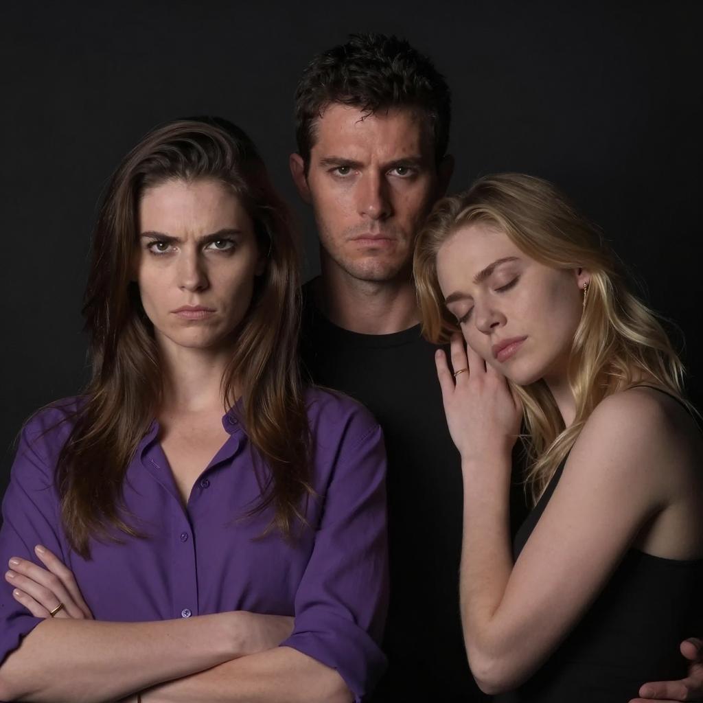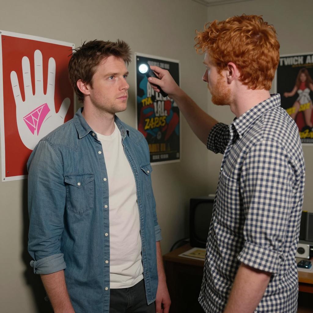 Photograph of a hallway scene with five people. Woman with blonde hair, red jacket, and silver helmet leans forward, smiling. Man with brown hair, green and yellow varsity jacket, stands to her left. Background shows three people hugging, one in a blue shirt, one in a striped shirt, and one with long brown hair. Wood-paneled wall, partially visible door frame. One person in grey sweater stands to the right. Intense expressions on faces in background.