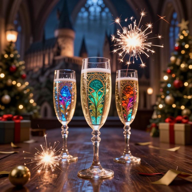 Wingardium leviossa, two glasses at the table, sparkling, hall of hogwarts decorated for the new year, glass in weightlessness, sparklers around champagne glass, hyper-detail, surreal, colorful, art nouveau, octane rendering, professional photoshoot