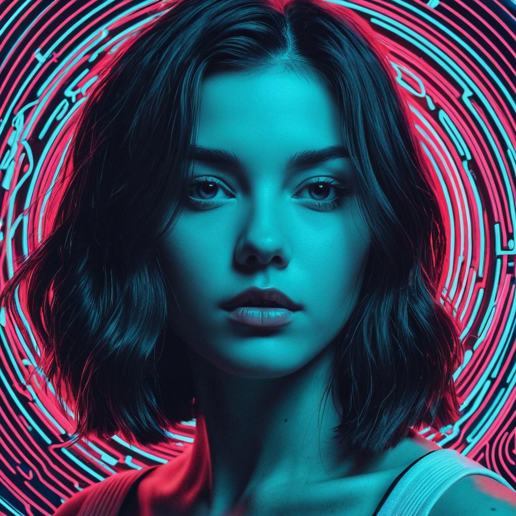 Close-up portrait of a young woman with dark short hair and a determined gaze, illuminated by blue and pink neon lights. The background features concentric circular neon patterns, creating a futuristic and retro aesthetic with illusions and free-flowing lines. The image combines emotive expression with innovative digital art techniques.
