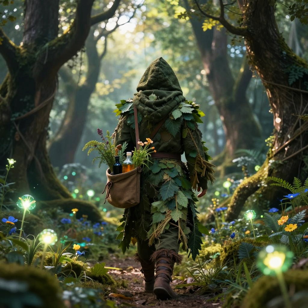 A digital fantasy artwork depicts a hooded figure with leafy, green attire and brown boots, walking away through a mystical forest. The figure carries a brown satchel with ferns and small flowers. Sunlight filters through tall, moss-covered trees, illuminating a path lined with glowing, magical lights and vibrant blue and yellow flowers. The forest is dense with lush greenery, and the atmosphere is enchanted and serene. The detailed textures of leaves and moss contrast with the soft, ethereal glow of the lights. The perspective emphasizes the figure's journey into the enchanted forest.
