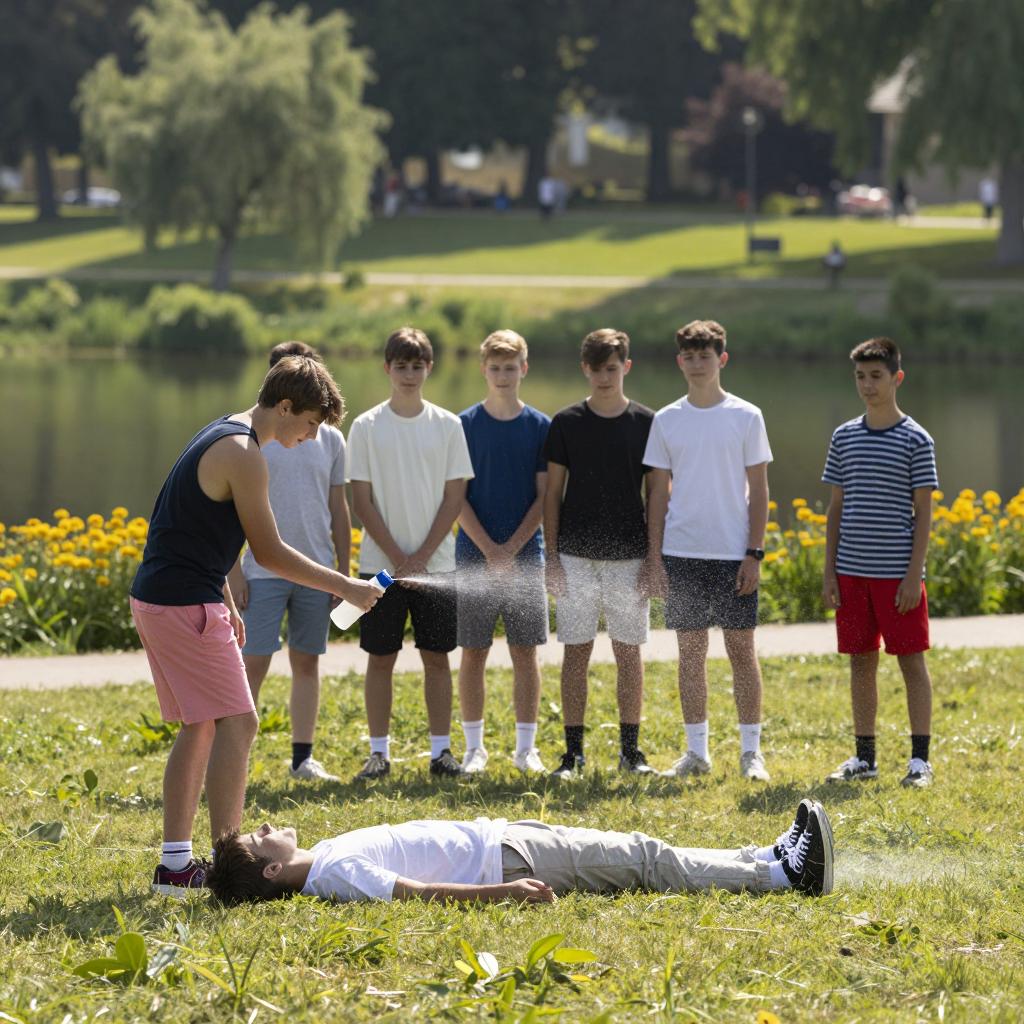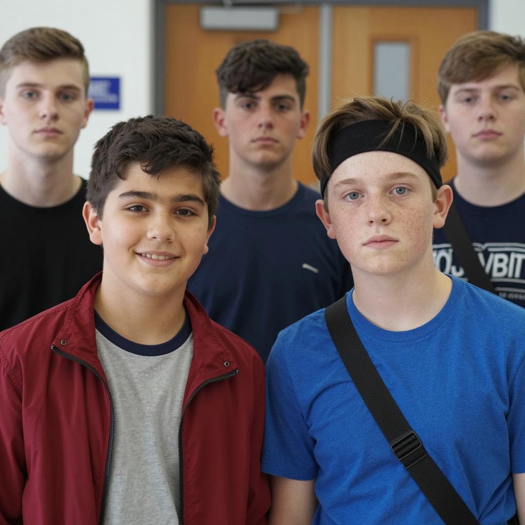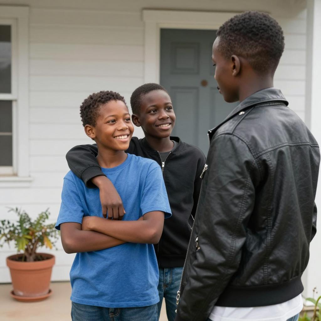 Four boys sitting on a porch. Boy in blue striped shirt and gray cap sits left, eyes closed. Boy in blue floral shirt and necklace sits center, looking forward. Boy in blue and white striped shirt and blue cap sits right, looking at boy in center. Boy in blue and white striped shirt and backward blue cap sits front, holding corn on the cob, looking right. Background includes trees and porch structure.