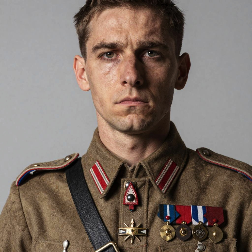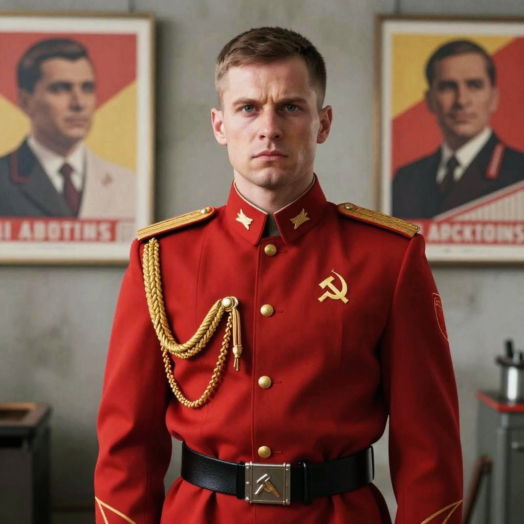 Soviet gigachad standing confidently in a red military uniform with gold epaulets, iconic hammer and sickle badge, strong jawline and piercing eyes, set against a stark, industrial Soviet-era backdrop with bold propaganda posters, hyper-realistic style.