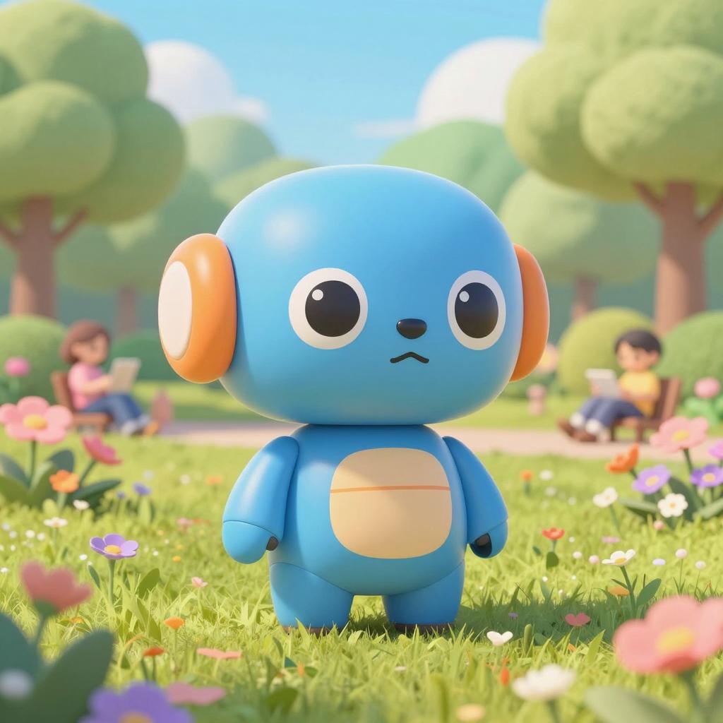 A pastel-colored, cartoon-style robot dog with large expressive eyes standing in a vibrant sunny park surrounded by flowers and greenery. The playful robot features smooth, rounded shapes in blue and orange hues, set against a backdrop of trees, blooming pink and purple flowers, and people in the distance enjoying the park.