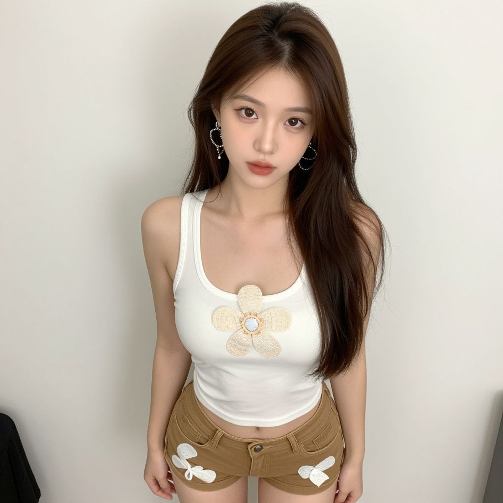 Photograph of an East Asian woman with fair skin and long black hair, styled in a top bun with a side braid. She wears a black spaghetti-strap crop top with silver glittery text "BOPI" across the chest. Her expression is neutral, and she gazes directly at the camera. The background is a plain white, making her the focal point. The image is sharply focused, and the lighting is even, highlighting her facial features and hair texture.