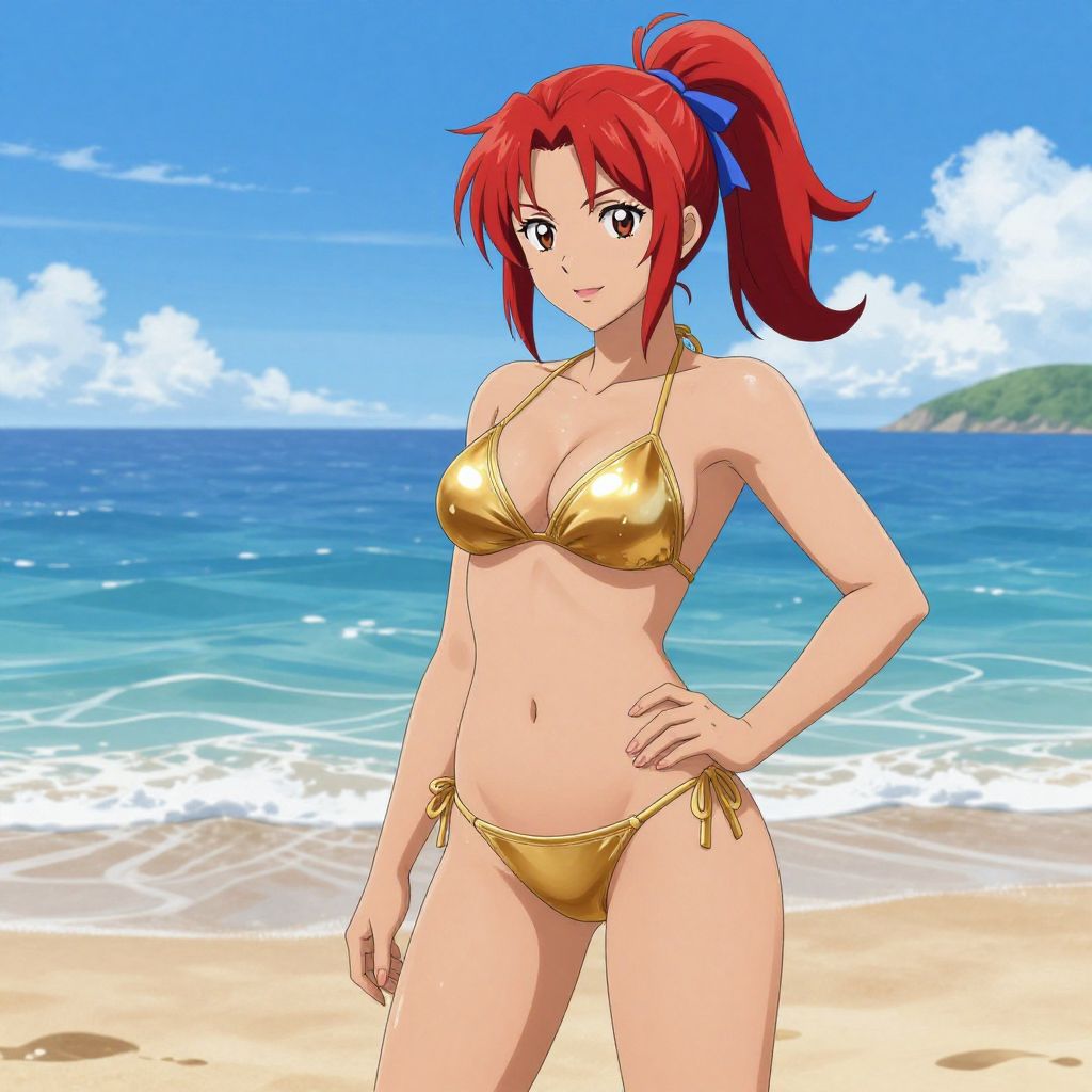 Anime-style digital drawing of a red-haired woman in a shiny gold bikini, standing confidently on a sunny beach with clear blue water and a bright sky in