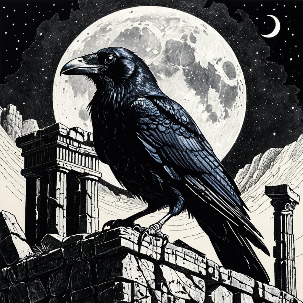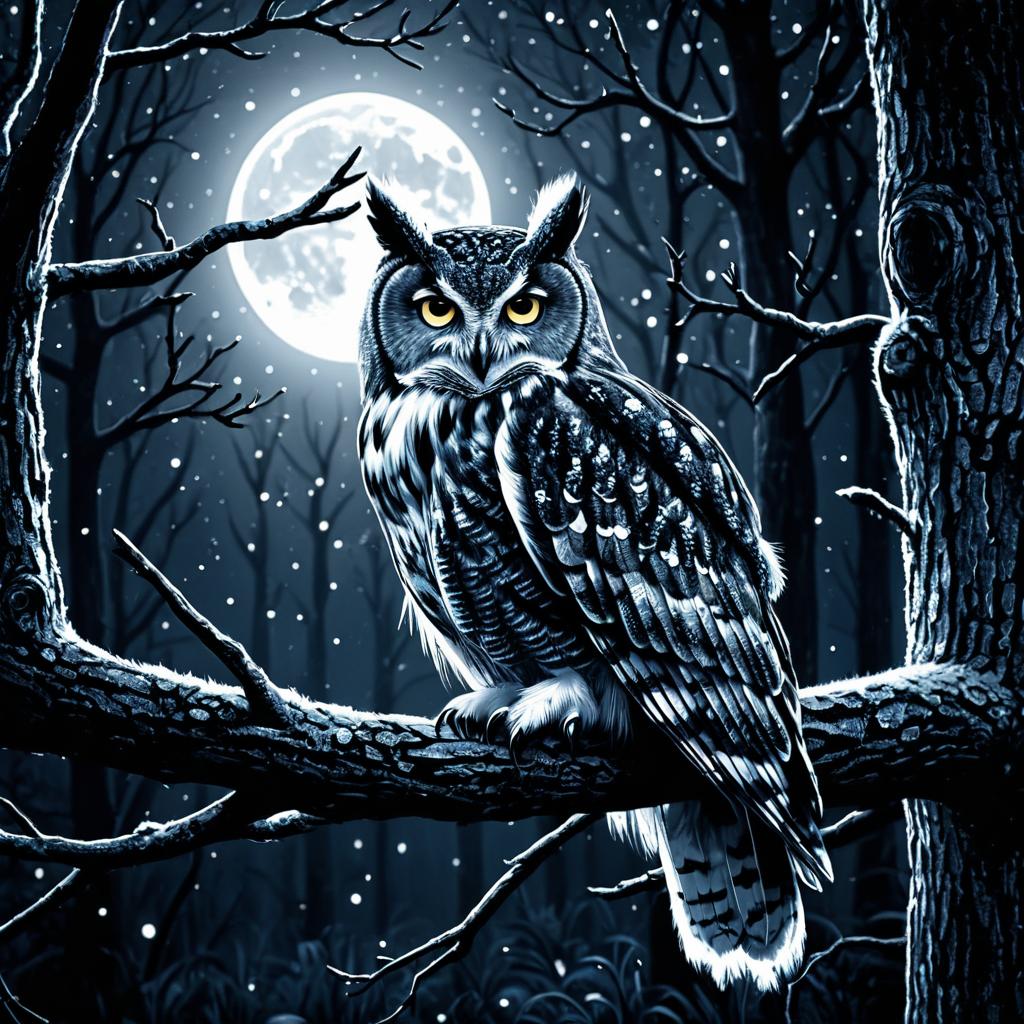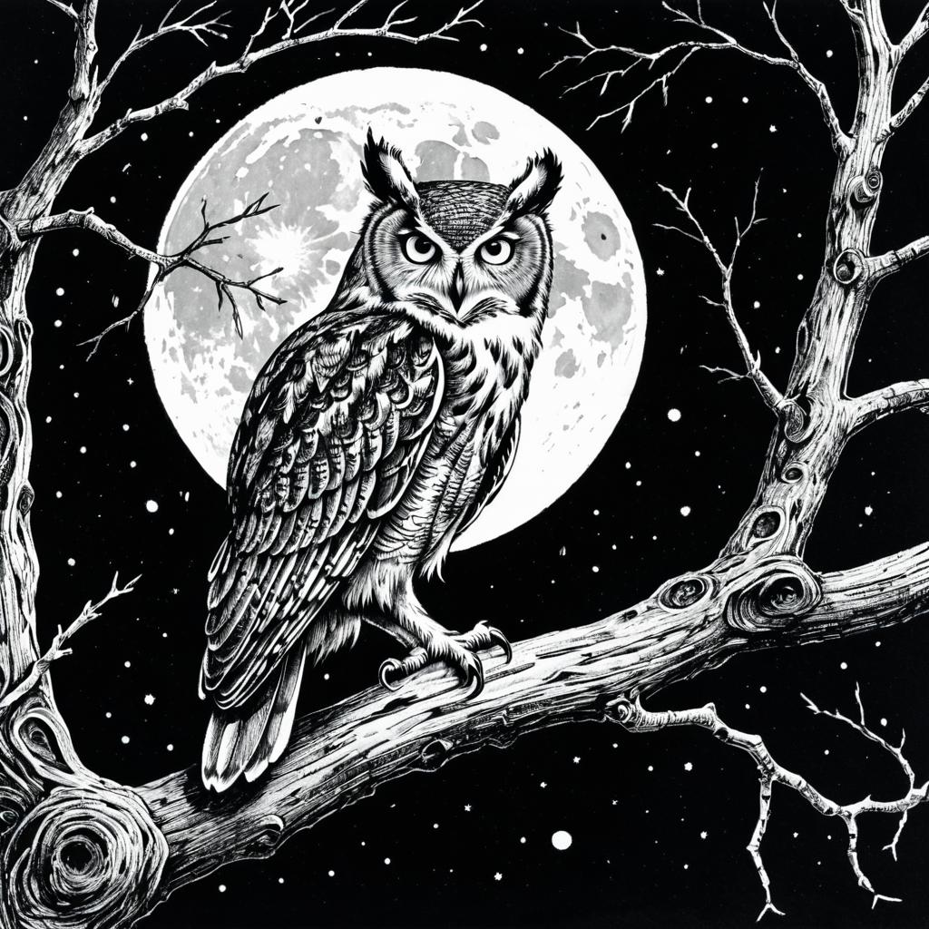 Intricate pen and ink drawing of an ancient owl perched on a gnarled old branch, with the moon glowing softly in the background, detailed plumage and piercing eyes.