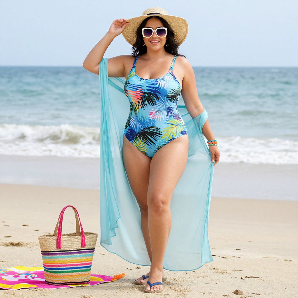 Photograph of a curvy woman with medium brown skin and black curly hair, wearing a colorful, tropical-patterned one-piece swimsuit, white sunglasses, and a wide-brimmed straw hat. She has a light blue, sheer cover-up draped over her arms and is standing on a sandy beach with the ocean in the background. She is smiling and adjusting her hat with her right hand. In the foreground, there is a striped beach bag with red handles and a colorful towel beneath it. The sky is clear, and the waves are gently crashing in the distance.