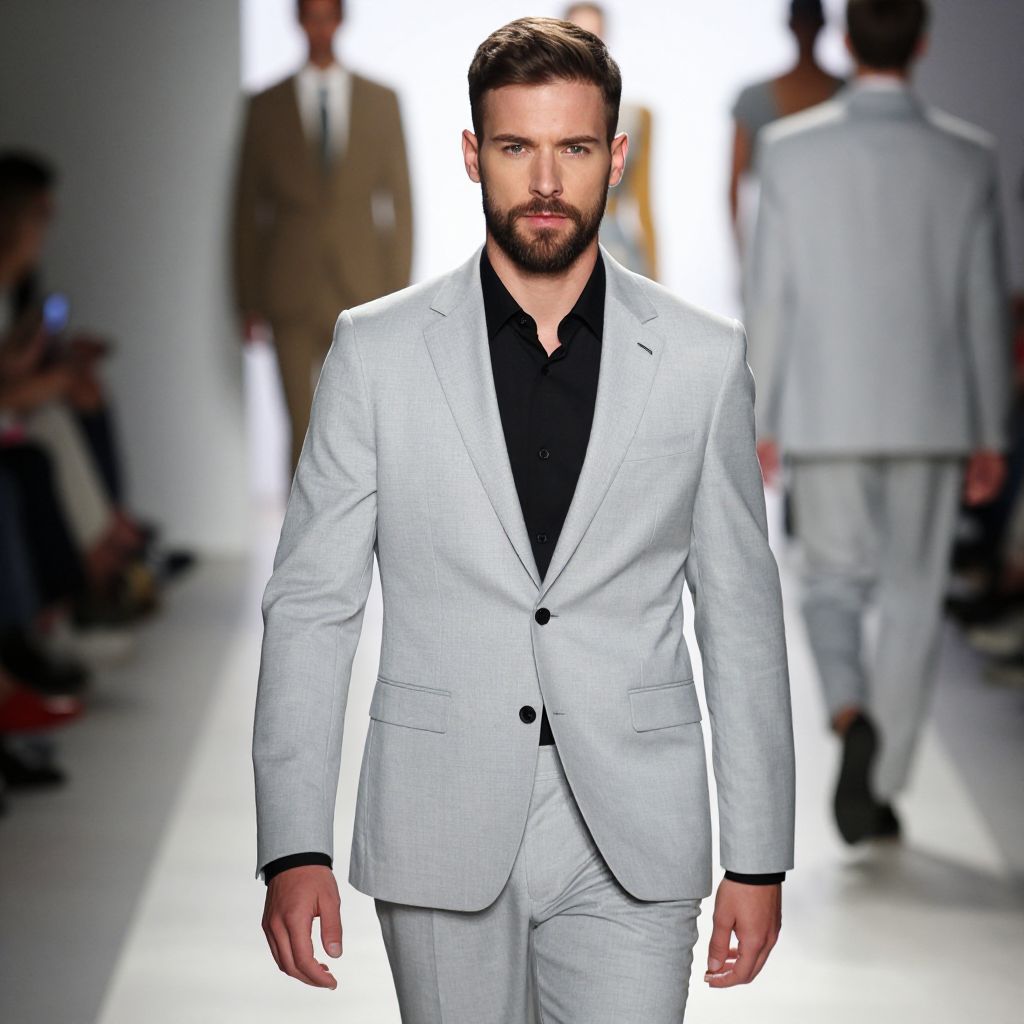 Photograph of a male model walking down a fashion runway. He has a well-groomed beard and dark brown hair styled neatly. He wears a light gray, single-breasted suit with black buttons, a black dress shirt, and no tie. His physique is average, and he has a confident expression. The background is brightly lit with an out-of-focus white light, creating a high contrast effect. Other male models in similar suits are visible in the blurry background, walking away from the camera. The runway is white, and there are seated audience members on either side.