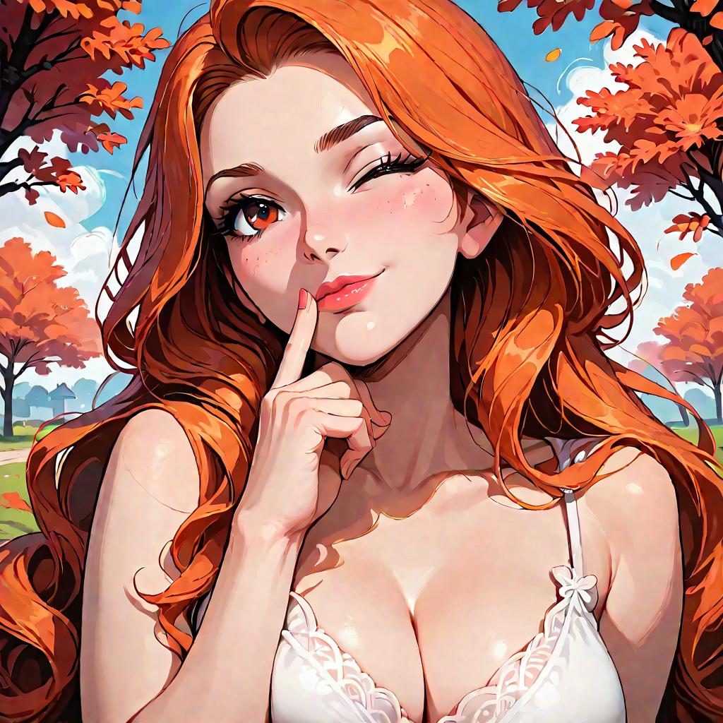 Digital anime-style portrait of a beautiful, red-haired woman with long, wavy hair, winking, and touching her finger to her lips, wearing
