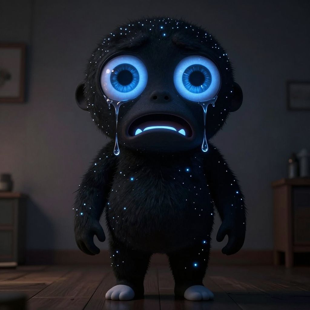 Digital CGI of a dark, furry, teary-eyed creature with glowing blue eyes and tears, standing in a dimly lit room.
