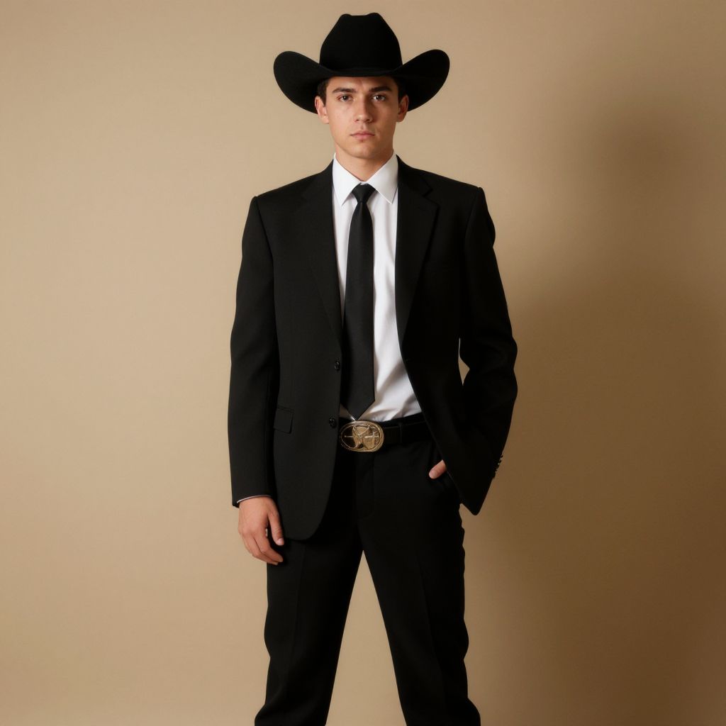 Photograph of a young man standing against a plain beige background. He has light skin and dark hair, wearing a black cowboy hat, black suit with a white dress shirt, and black tie. His right hand rests in his pants pocket, and his left arm hangs by his side. A detailed, silver-toned belt buckle is visible at his waist. The suit is well-fitted, and the overall style is modern with a touch of Western influence. The lighting is even, highlighting his formal attire and confident posture.