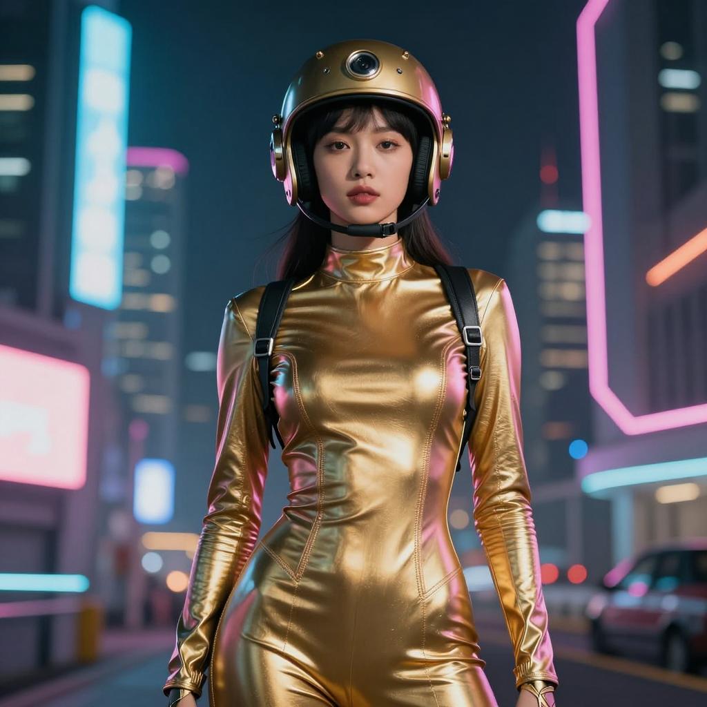 This striking image features a futuristic woman wearing a sleek golden outfit and a high-tech helmet, embodying a vibrant cyberpunk aesthetic. The neon cityscape in the background creates a dynamic atmosphere, highlighting the blend of retro and futuristic elements.