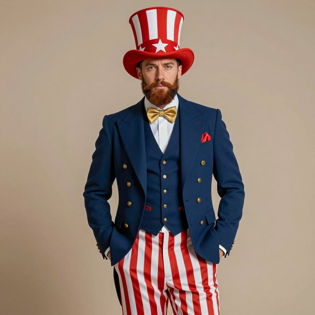 Photograph of a man with light skin, brown hair, and a mustache, wearing a black Civil War-era military uniform, holding an American flag. He stands against a light blue sky, looking intently to the right. The flag is on the right side, slightly behind him. His right hand grips the flagpole.