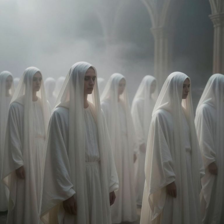 In a hushed sanctuary shrouded by mist, cloaked figures stand in solemn procession, their ethereal presence evoking a profound sense of transience and redemption, as if time itself is being reversed to absolve the regrets of those who fade into existence.