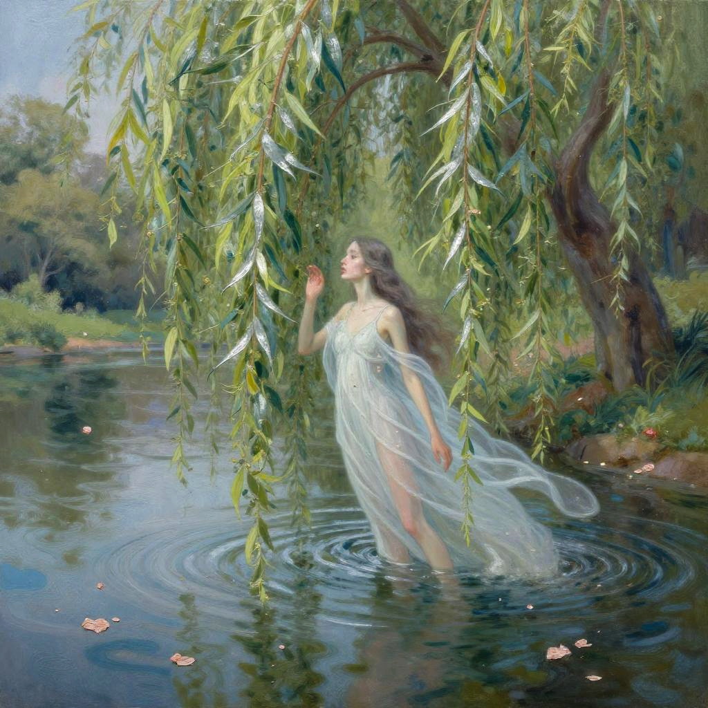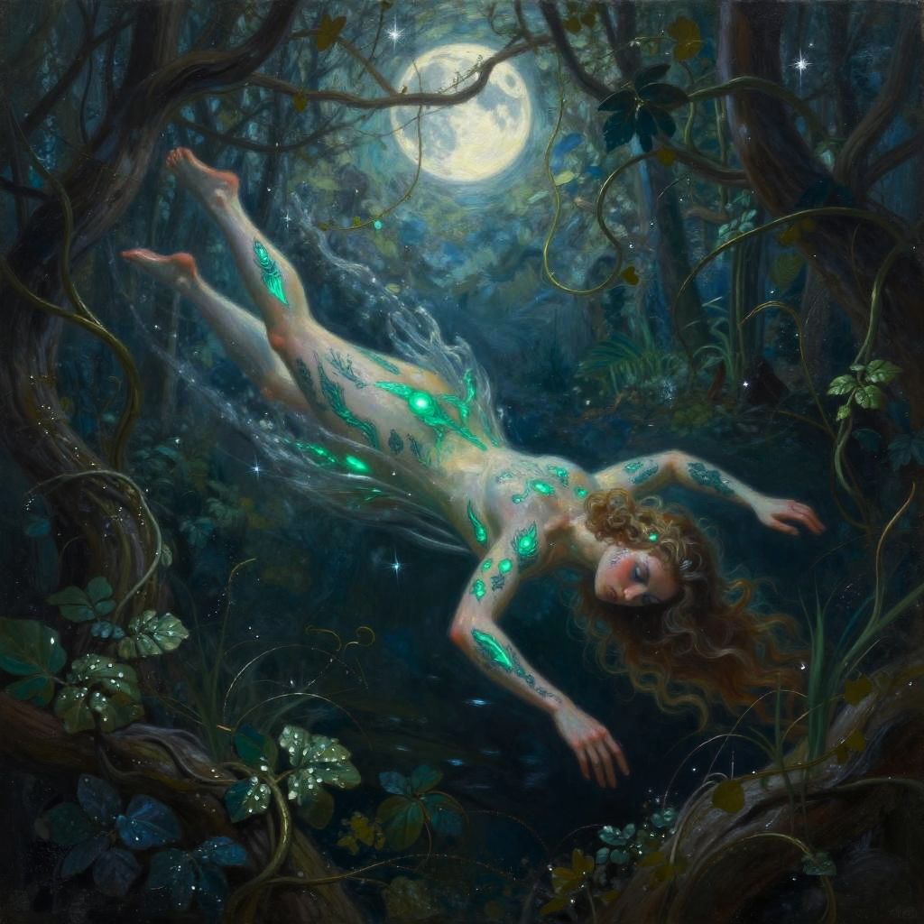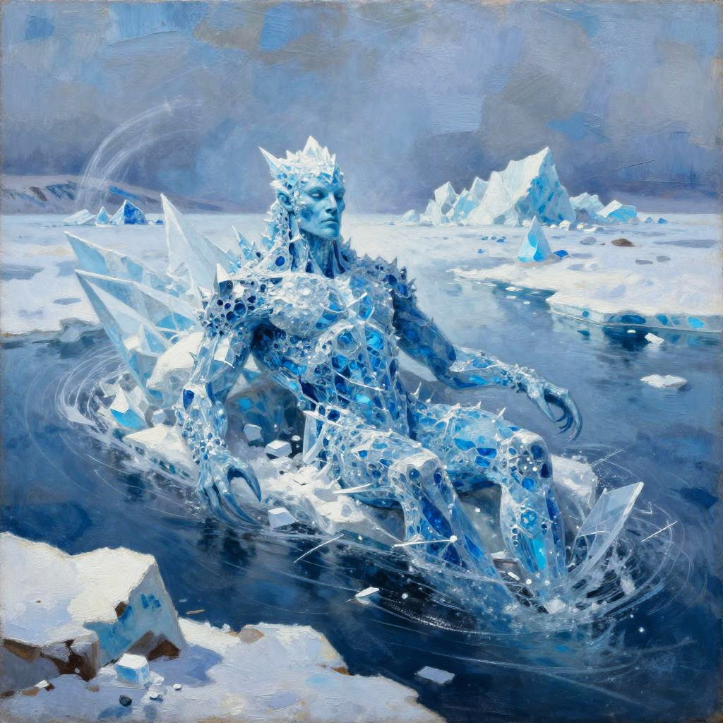 Surreal oil painting of an frostborn ice giant with crystalline blue skin, swimming in a frozen tundra, surrounded by shattered glaciers and swirling snow.