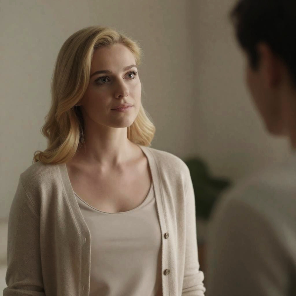 Blonde woman with long hair, wearing a striped shirt, praying with hands clasped in front of her, dimly lit night scene, green foliage in background. Man in plaid shirt with back to camera in foreground. Two people, intense expressions.