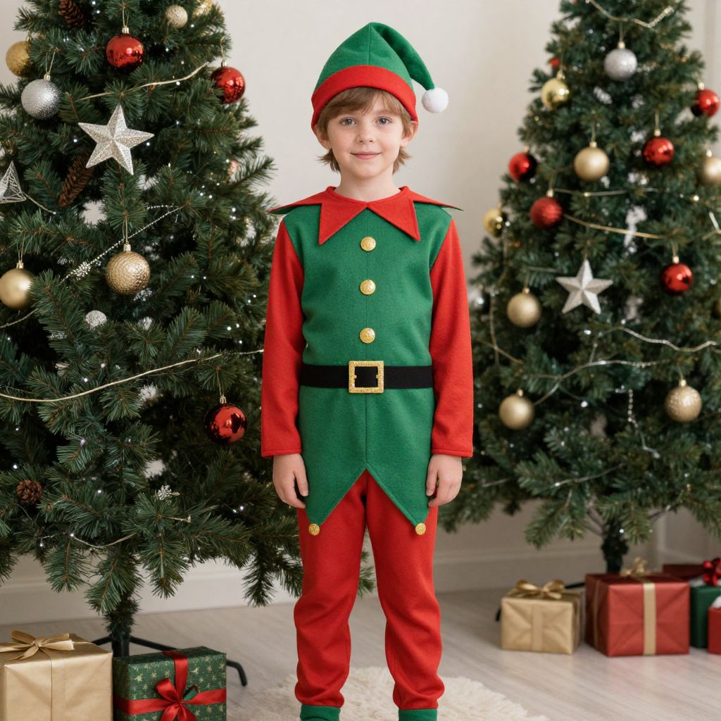 Elf Suit Christmas Costume, dressed in elf outfit standing in front of christmas tree