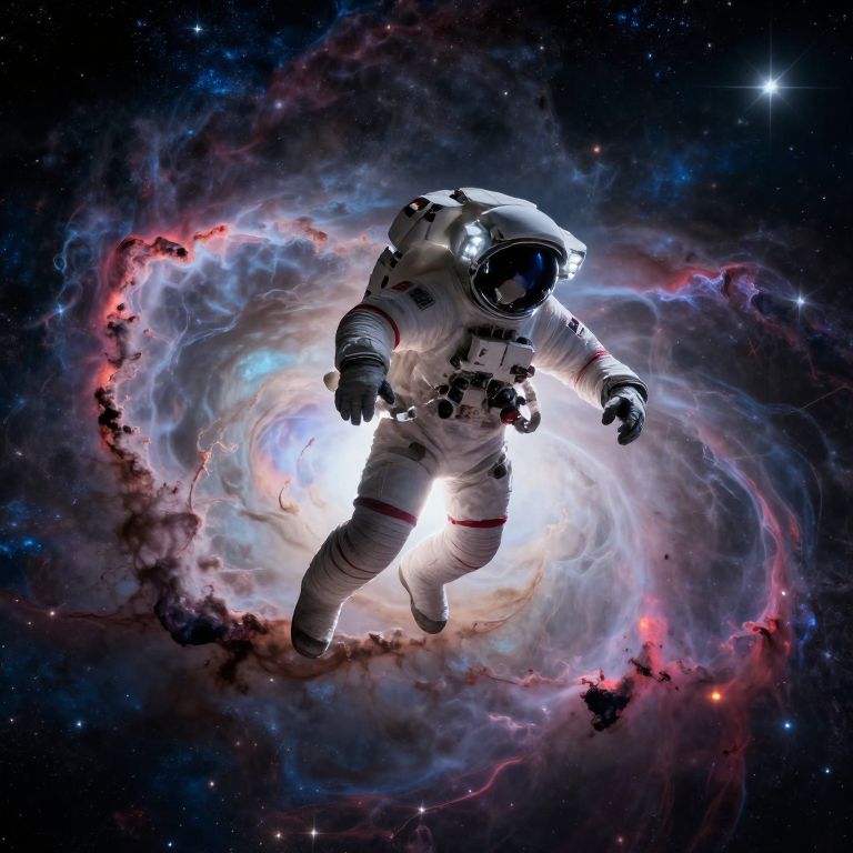 Photorealistic digital artwork of an astronaut floating in space, surrounded by a swirling, colorful nebula with bright white light emanating from the center.
