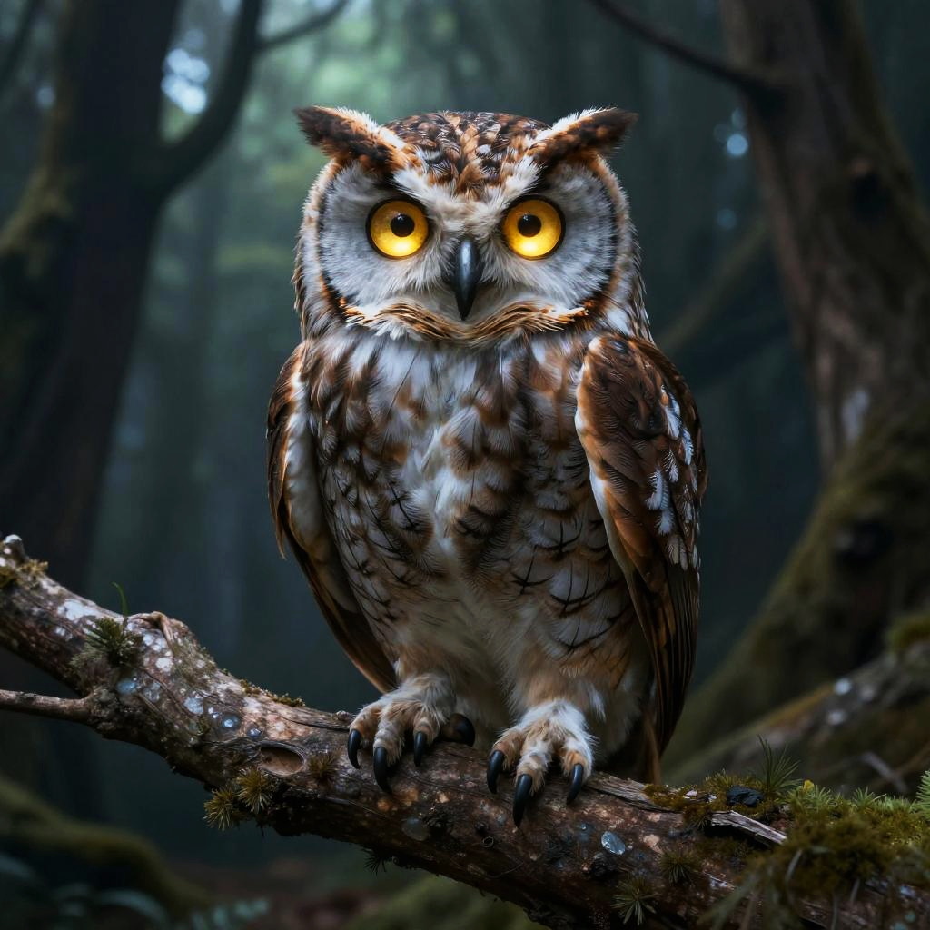 A majestic great horned owl with prominent ear tufts and intense amber eyes, in snow-covered pine forest at dusk, featuring subdued lighting with cool blue shades, highly detailed and realistic fur textures