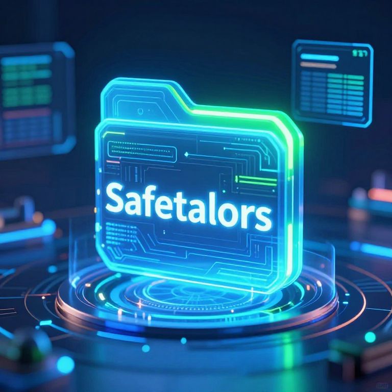 This digital CGI image features a glowing neon-blue, stylized file icon with the word "Safetors" in white, bold letters centered on it. The icon is outlined with a mix of blue and green neon lights, giving it a futuristic, cybernetic appearance. It floats above a dark, metallic surface with concentric circular patterns. In the background, there are blurred, neon-lit screens with text, adding to the high-tech, digital environment. The overall color palette is dominated by blue and green neon lights against a dark, almost black, background.