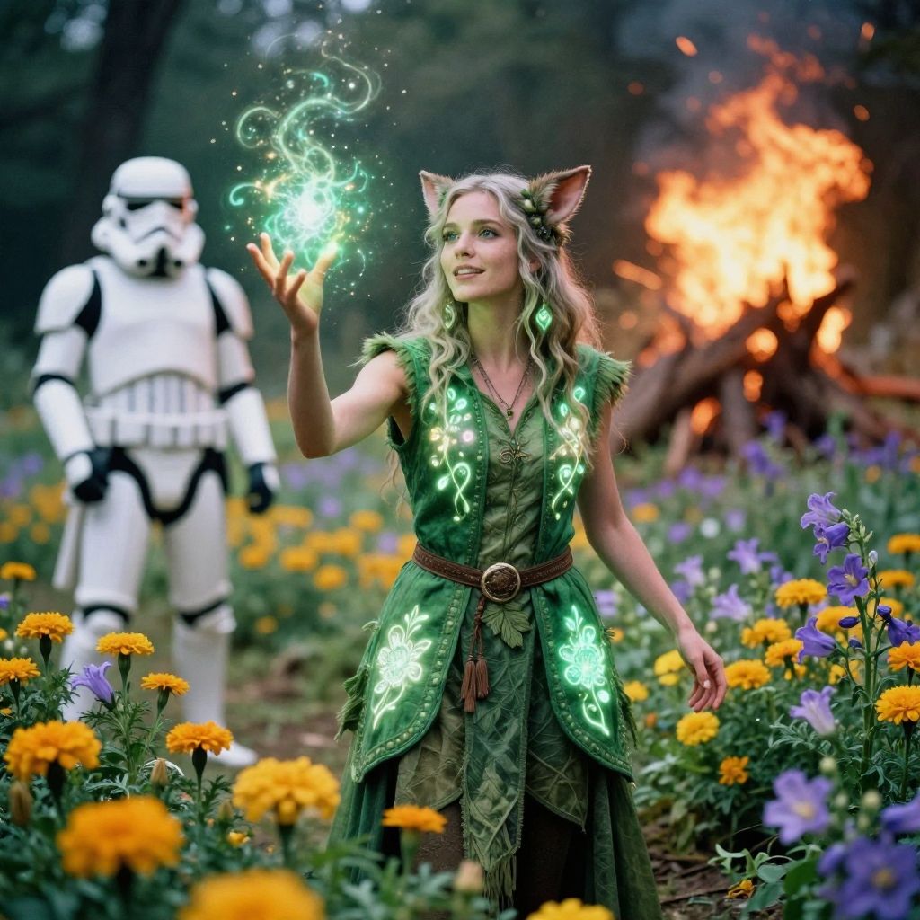 Solo, (full body:0.6), looking away, detailed background, detailed face, biomancer, joyful, nature themed green mage sleeveless vest, glowing floral motifs, casting spell, natural regeneration, mystical aura, botanical secrets marigolds, bellflowers, primroses ethereal glow, ethereal atmosphere, **(animal ears, destruction, explosion, fire:1.2), **, white (star wars empire style:0.7), 24mm, (analog, cinematic, film grain:1.3), Bokeh DOF, (Masterpiece:1.3) (best quality:1.2) (high quality:1.1)