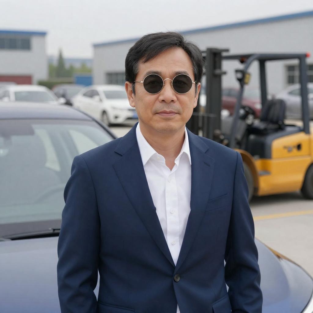 Middle-aged Asian man with dark hair, wearing round sunglasses and a navy blue suit over a white shirt, stands in front of a blue car. Background includes a yellow forklift, parked cars, and industrial buildings. Overcast sky. Man has a neutral expression.