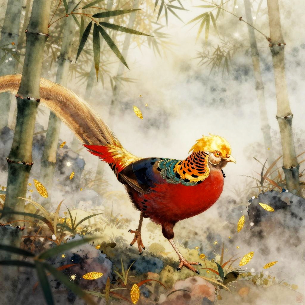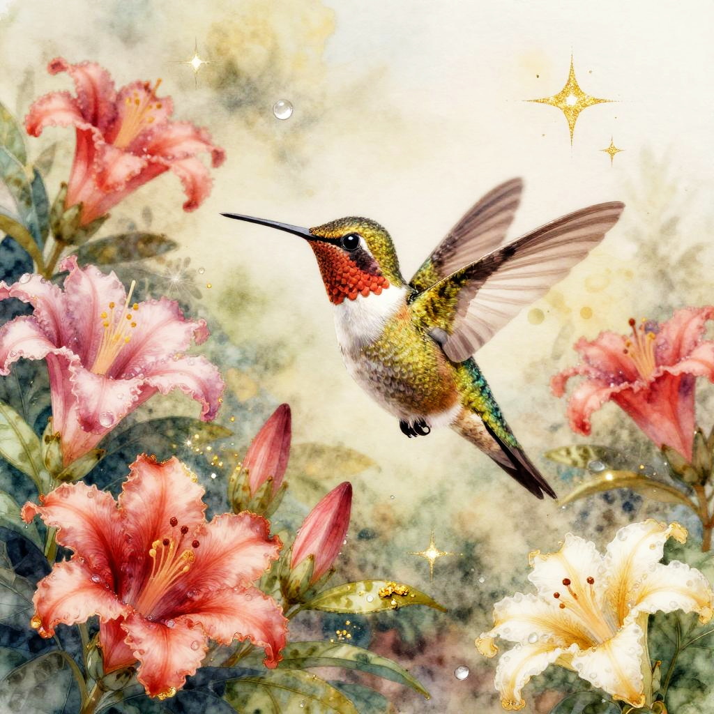 A detailed watercolor illustration of a gentle white dove wandering through a sunlit ancient cherry blossom orchard surrounded by soft petals drifting and shimmering light rays, with gold accents and celestial magic.