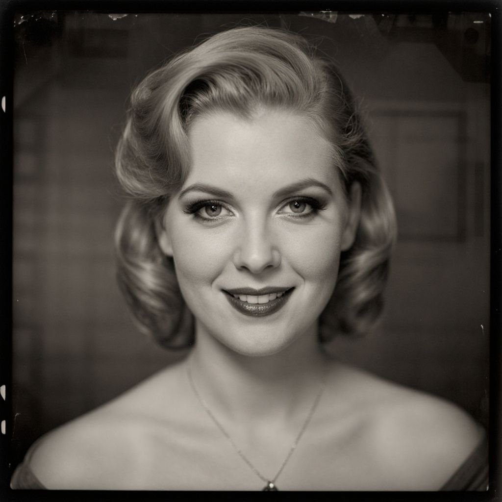 Sepia-toned portrait of a 1940s-style woman with wavy dark hair, pearl earrings, and a shimmering, V-neck dress