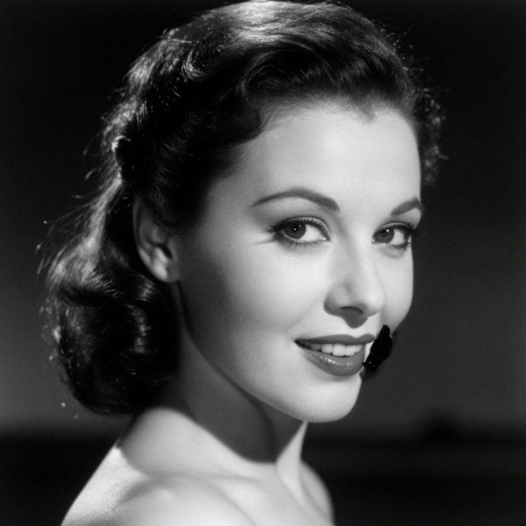 Sepia-toned photograph of a fair-skinned woman with classic 1940s Hollywood glamour. She has dark, wavy, shoulder-length hair adorned with a small pearl hairpin. Her makeup includes dark lipstick and subtle eyeliner. She wears a metallic, gold-patterned, V-neck dress with short sleeves. The background is a softly blurred, geometric-patterned backdrop with circular light bokeh. Her expression is calm and slightly smiling, exuding vintage elegance. The overall image has a warm, nostalgic feel, reminiscent of old movie star portraits.