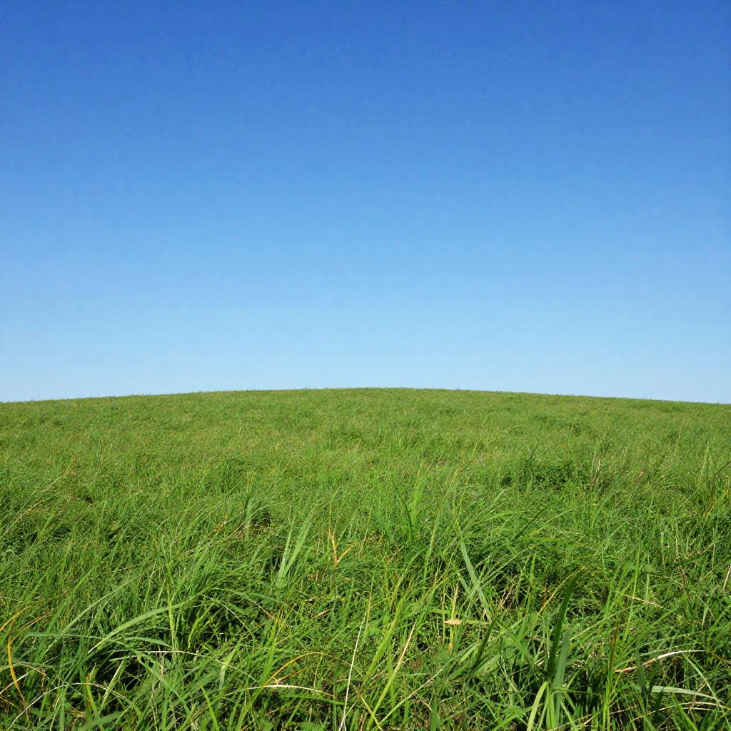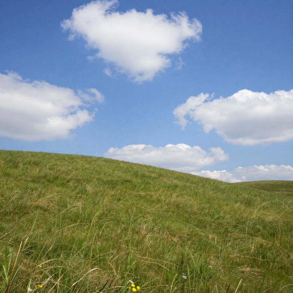 Windows xp default wallpaper inspired scene with rolling grassy hill, bright blue sky dotted with soft clouds, photorealistic style, detailed natural textures
