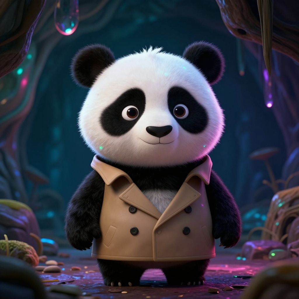 Cute CGI panda with black-and-white fur, wearing a beige trench coat, stands in a colorful, glowing, cave-like forest.